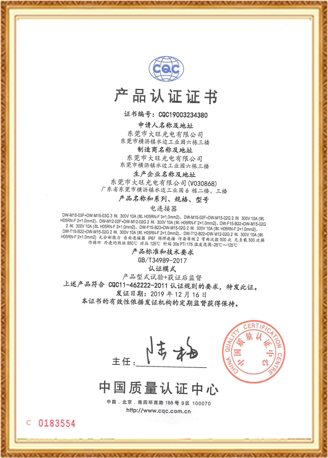 防水連接器CQC證書
